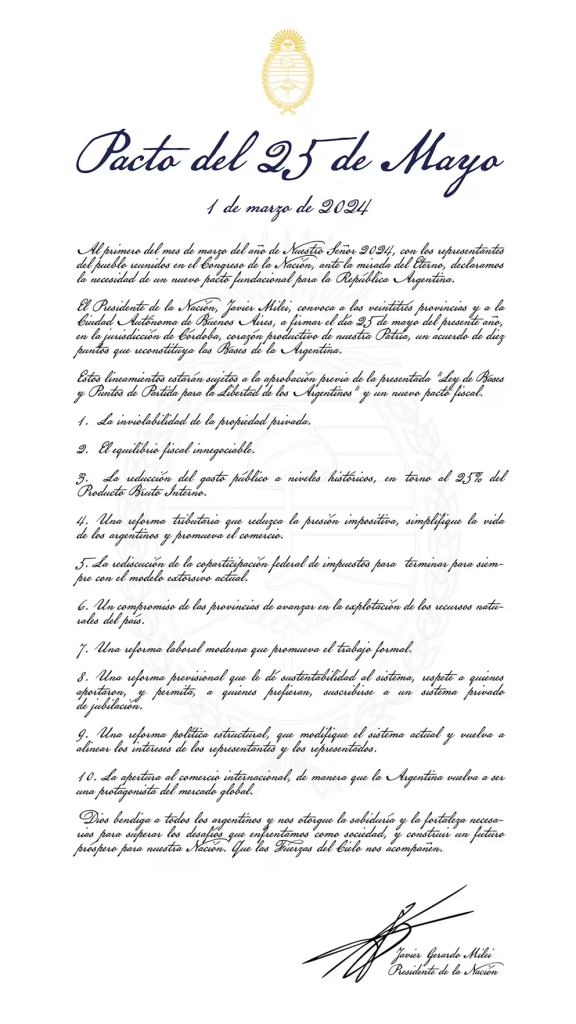 Este texto, que fue difundido esta mañana por el vocero presidencial Manuel Adorni, es el que se presentará en la vigilia del 8 al 9 de Julio en Tucumán, en el marco de la celebración por el Día de la Independencia. Allí, Milei, gobernadores, ex presidentes y otros referentes nacionales, firmarán el Pacto de Mayo que propuso el jefe de Estado.
