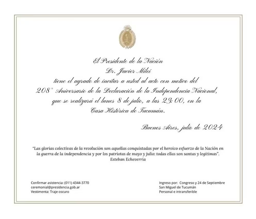 Las invitaciones correspondientes fueron enviadas el martes por la noche, con la firma del mandatario nacional y con una frase del escritor y poeta Esteban Echeverría que reza que “las glorias colectivas de la revolución son aquellas conquistadas por el heroico esfuerzo de la Nación en la Guerra de la Independencia y por los patriotas de mayo y julio: todas ellas son santas y legítimas”.