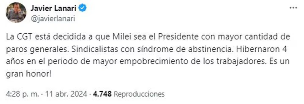 Javier Lanari, subsecretario de prensa en la presidencia de la Nación, también se pronunció en X: “La CGT está decidida a que Milei sea el Presidente con mayor cantidad de paros generales. Sindicalistas con síndrome de abstinencia. Hibernaron 4 años en el periodo de mayor empobrecimiento de los trabajadores. ¡Es un gran honor!”.