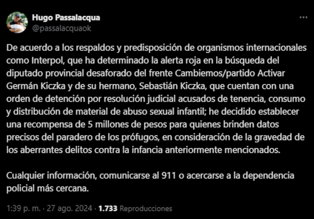 Passalacqua publicó el anuncio en su cuenta de X este martes. “De acuerdo a los respaldos y predisposición de organismos internacionales como Interpol, que ha determinado la alerta roja en la búsqueda del diputado provincial desaforado del frente Cambiemos/partido Activar Germán Kiczka y de su hermano, Sebastián Kiczka, que cuentan con una orden de detención por resolución judicial acusados de tenencia, consumo y distribución de material de abuso sexual infantil, he decidido establecer una recompensa de 5 millones de pesos para quienes brinden datos precisos del paradero de los prófugos, en consideración de la gravedad de los aberrantes delitos contra la infancia anteriormente mencionados”, escribió.