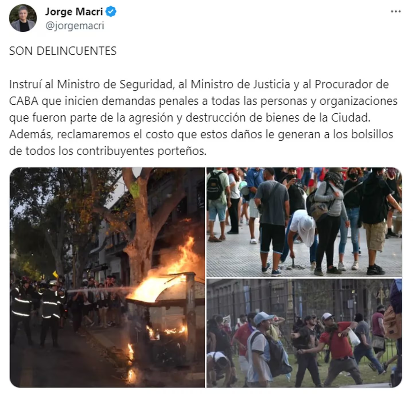 El jefe de gobierno porteño, Jorge Macri, también se refirió a los incidentes en sus redes. “Son delincuentes. Instruí al Ministro de Seguridad, al ministro de Justicia y al Procurador de CABA que inicien demandas penales a todas las personas y organizaciones que fueron parte de la agresión y destrucción de bienes de la Ciudad. Además, reclamaremos el costo que estos daños le generan a los bolsillos de todos los contribuyentes porteños”, fue el mensaje del mandatario.