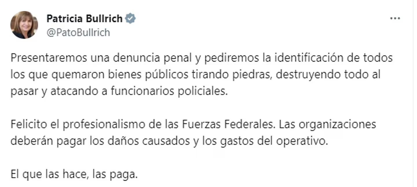 “Felicito el profesionalismo de las Fuerzas Federales. Las organizaciones deberán pagar los daños causados y los gastos del operativo”, expresó Bullrich en su cuenta de X (exTwitter).