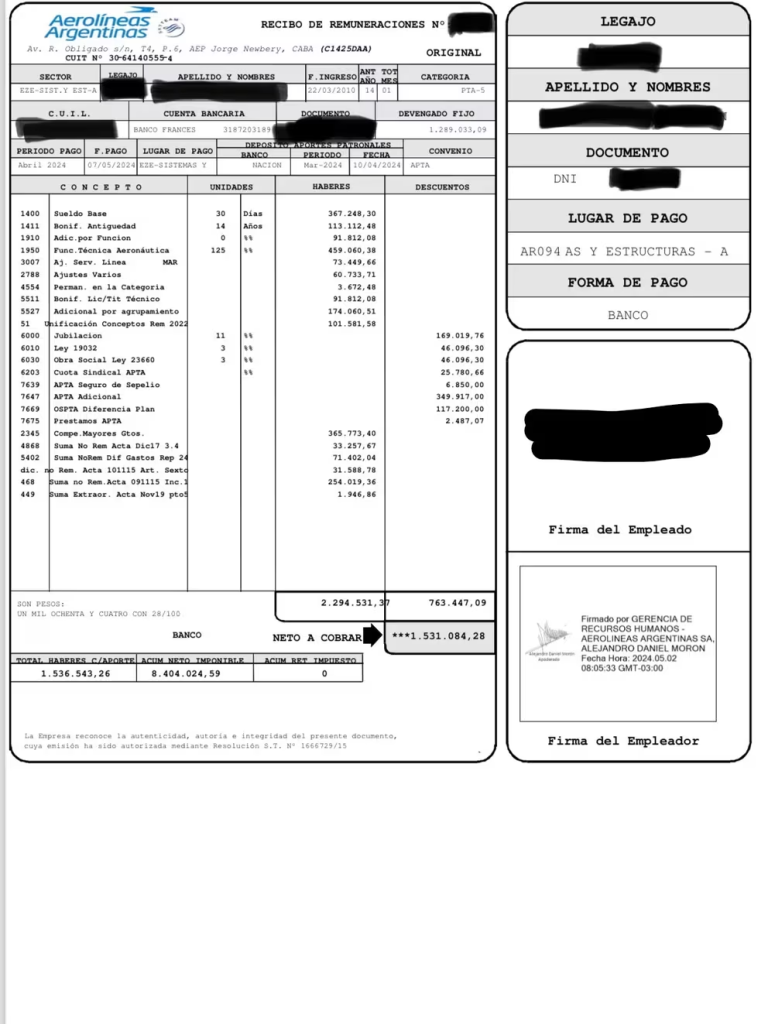 Pero la categoría mayoritaria entre el personal técnico aeronáutico es la PTA 5, que por edad y antigüedad en la empresa suman 785, y reciben $2,2 millones en promedio en bruto. Según dos recibos de sueldos enviado por Cirielli a Infobae la remuneración de un trabajador de esa categoría con 15 años de antigüedad, en mano es de $1,5 millones, y de otro también PTA 5 con 40 años en la empresa, $2,1 millones de bolsillo.
