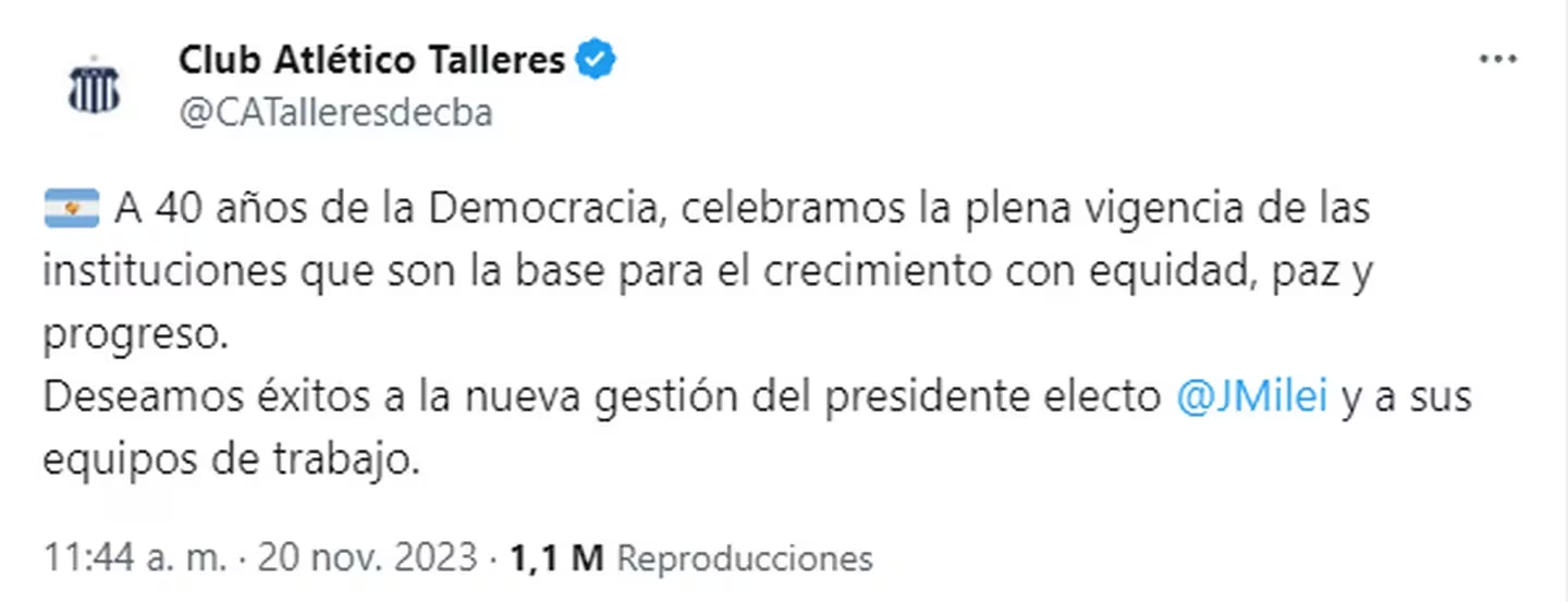 Además, en el último tiempo el elenco cordobés tuvo reacciones muy distintas a los otros clubes de la Liga Profesional: no se expresó en contra de las SAD y fue el único en felicitar a Javier Milei, tras ser elegido presidente.