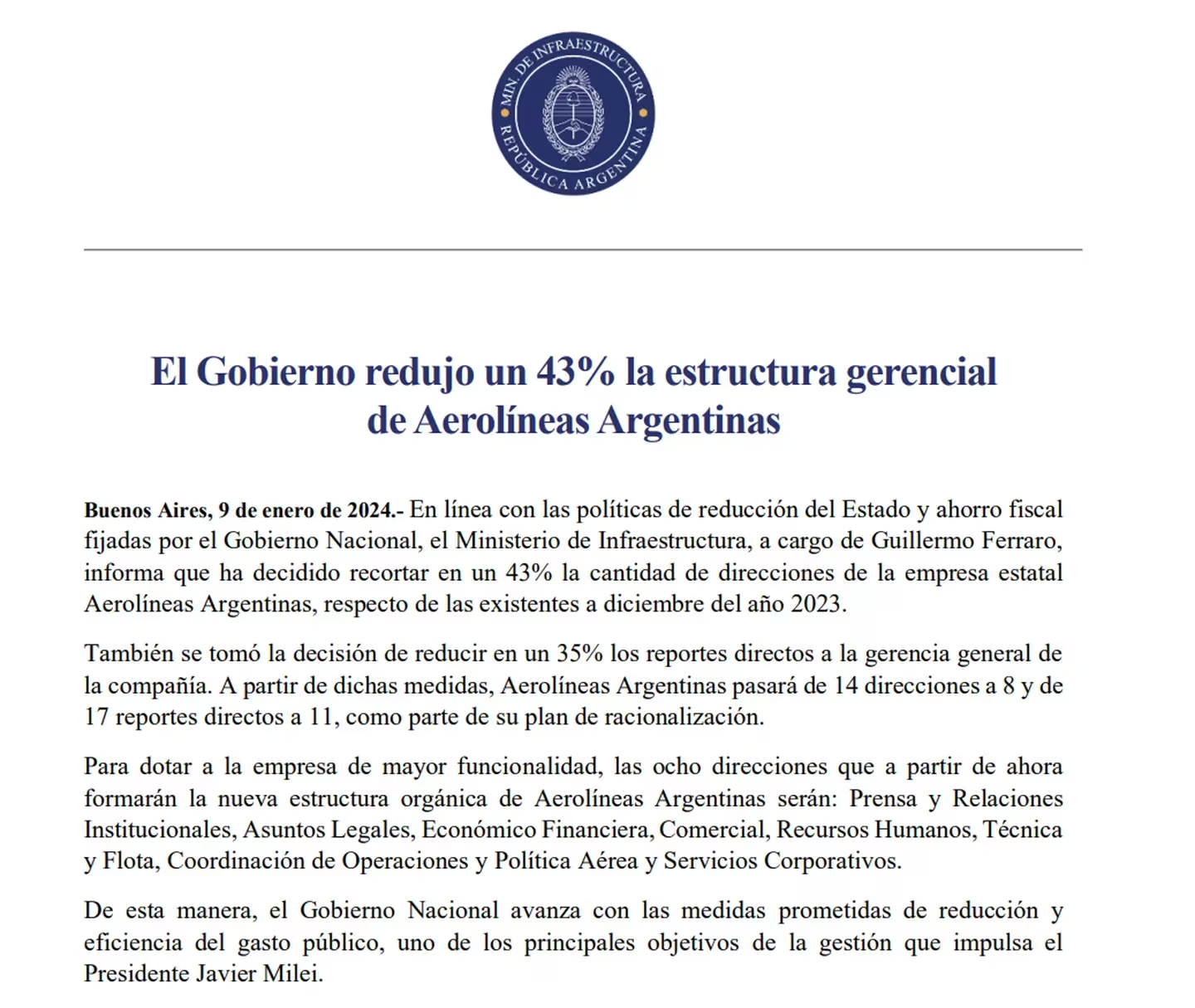 “En línea con las políticas de reducción del Estado y ahorro fiscal fijadas por el gobierno nacional, el Ministerio de Infraestructura, a cargo de Guillermo Ferraro, informa que ha decidido recortar en un 43% la cantidad de direcciones de la empresa estatal Aerolíneas Argentinas, respecto de las existentes a diciembre del año 2023″, indicó el comunicado que difundió la compañía.