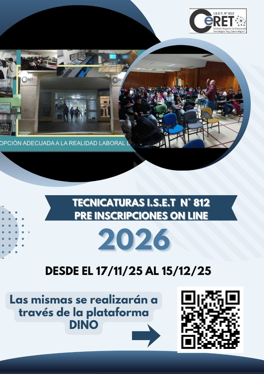 El Instituto Superior de Educación Tecnológica (I.S.E.T.) N° 812 “Ceret” anunció la apertura de las preinscripciones para el ciclo lectivo 2026. El período de registro se extenderá desde el 17 de noviembre hasta el 15 de diciembre de 2025, y se realizará de manera totalmente online a través de la plataforma DINO.