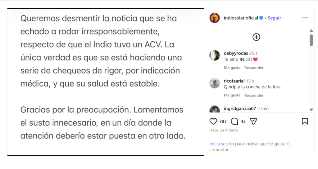 Ante la circulación de información errónea, la cuenta oficial del músico publicó un comunicado contundente: desmintió que hubiera sufrido un ACV y explicó que se trataba simplemente de controles médicos programados. “La única verdad es que se está haciendo una serie de chequeos de rigor y que su salud está estable”, señalaron.