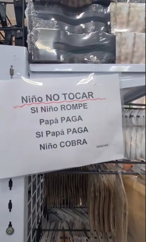 En las imágenes se puede ver una hoja escrita a mano que decía: “Niño no tocar. Si niño rompe, papá paga. Si papá paga, niño cobra. Gracias”.