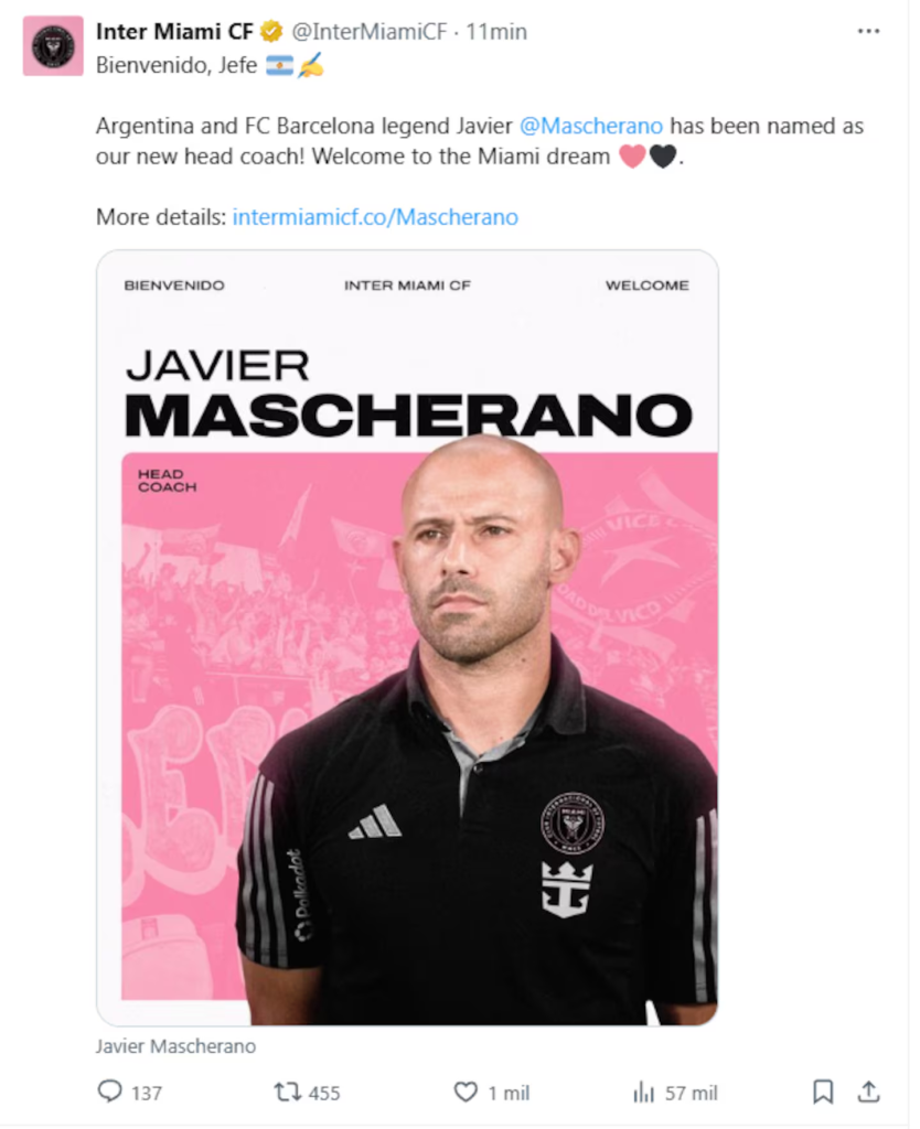 “A lo largo de su carrera como uno de los mejores jugadores del mundo y como entrenador experimentado, Javier siempre ha demostrado lo que lo hace grande: una determinación implacable con el conocimiento, los instintos y la comprensión para respaldarla. Estamos muy emocionados de darle la bienvenida para que lidere nuestro equipo”, dijo el inglés David Beckham, uno de los dueños del Inter Miami.