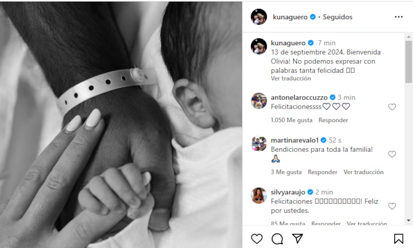 “13 de septiembre 2024. ¡Bienvenida, Olivia! No podemos expresar con palabras tanta felicidad”, escribió Agüero en su cuenta de Instagram (@kunaguero) junto a una imagen donde la beba toma de la mano a su mamá, Sofía. El Kun, de esta manera, se convirtió en padre por segunda vez.
