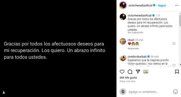 Desde la cuenta oficial de Heredia en Instagram apareció un mensaje con el fin de llevar tranquilidad a sus seguidores: “Gracias por todos los afectuosos deseos para mí recuperación. Los quiero. Un abrazo infinito para todos ustedes”.