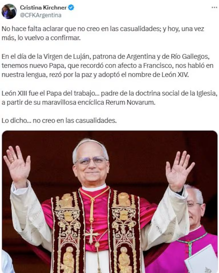 La exvicepresidenta Cristina Kirchner le dedicó un mensaje al nuevo papa León XIV en sus redes sociales. “No hace falta aclarar que no creo en las casualidades; y hoy, una vez más, lo vuelvo a confirmar”, escribió, a modo de preámbulo.