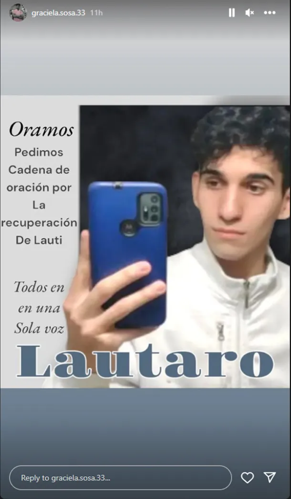 “Oramos. Pedimos cadena de oración por la recuperación de Lauti. Todos en una sola voz”, reza la imagen que compartió Graciela, la cual está acompañada de una foto donde se lo puede ver a Lautaro.