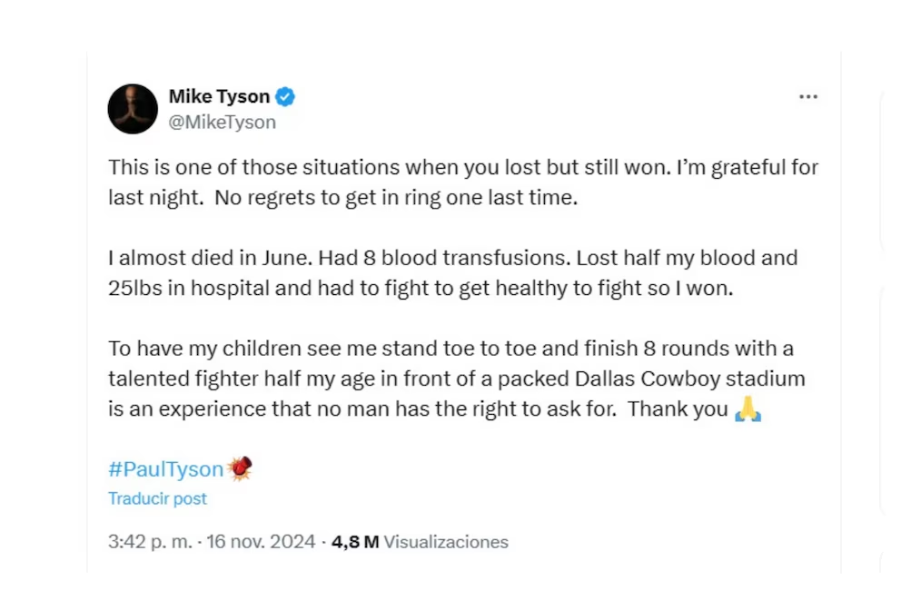 ”Esta es una de esas situaciones en las que perdiste, pero aún así ganaste. Estoy agradecido por lo de anoche. No me arrepiento de haber subido al ring una última vez”, escribió en un comunicado de tres párrafos breves en la red social. A continuación, reveló detalles del problema de salud que había obligado a postergar el combate programado el 20 de julio: “Casi muero en junio. Recibí ocho transfusiones de sangre. Perdí la mitad de mi sangre y 25 libras (11,3 kg) en el hospital y tuve que luchar para recuperar la salud y poder pelear, así que gané”.