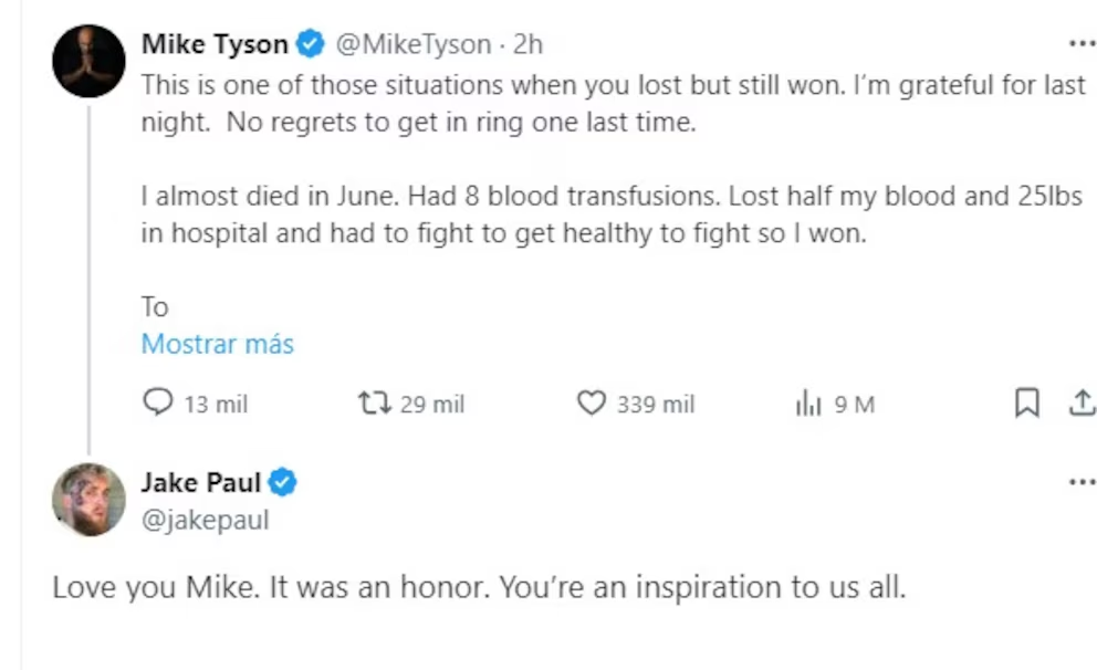 Uno de los comentarios más destacados fue el de su contrincante. Paul se mostró agradecido por la oportunidad de medirse a uno de los mejores boxeadores que dio la historia de este deporte: “Te quiero, Mike. Fue un honor. Eres una inspiración para todos nosotros”.