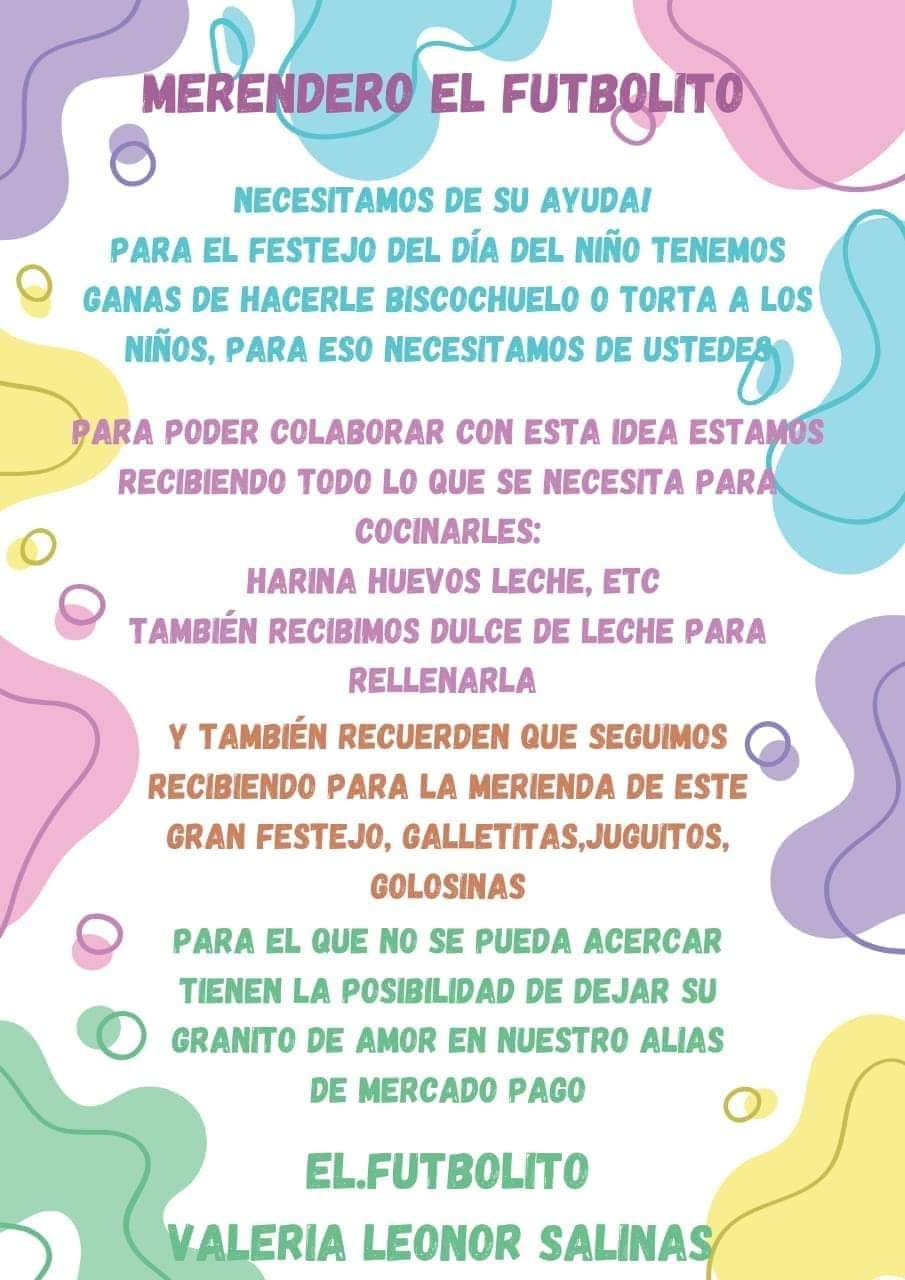 En este sentido, solicitan colaboración con golosinas, jugos, postres, budines, galletitas y todo lo que sea necesario para una rica merienda.