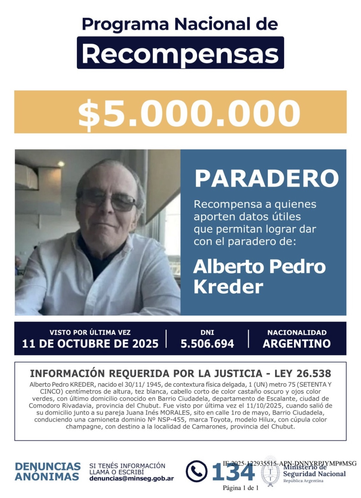 A dos meses de la desaparición de Juana Inés Morales y Pedro Alberto Kreder, el Ministerio de Seguridad nacional dispuso una recompensa para quienes aporten datos que permitan encontrar a los jubilados.