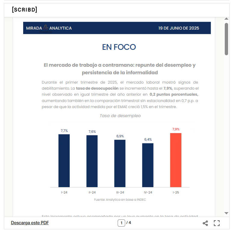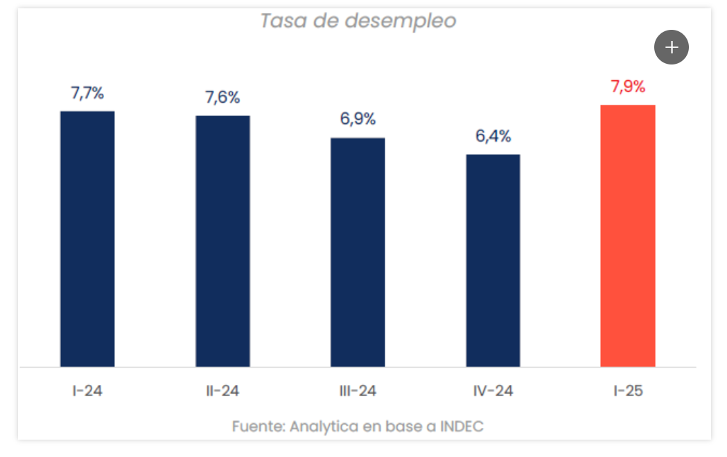 El ajuste permanente y el dólar alto que define al modelo económico de Javier Milei comenzaron a mostrar sus efectos más crudos en el mercado laboral. Según los datos oficiales de la Encuesta Permanente de Hogares del INDEC, la tasa de desocupación llegó al 7,9% en el primer trimestre de 2025, marcando un alza respecto al 7,7% del mismo período del año pasado.