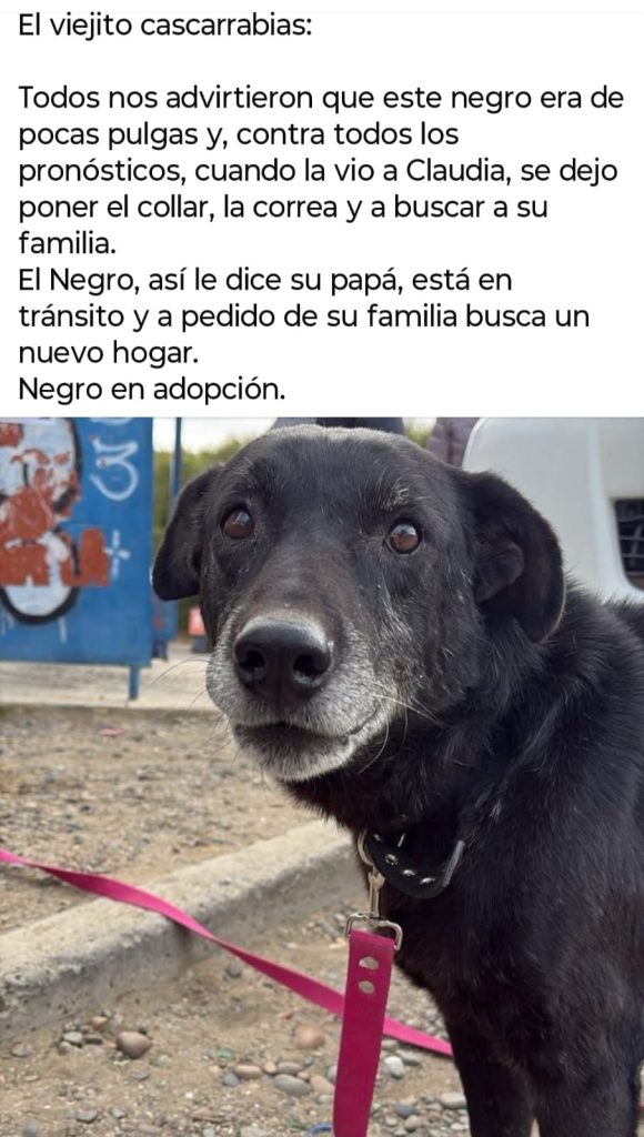 “El Negro”, como lo llama con cariño su papá humano, es un perro adulto que actualmente se encuentra en tránsito. A pedido de su familia, comenzó la búsqueda de un hogar definitivo donde pueda pasar sus años con tranquilidad, afecto y cuidados.