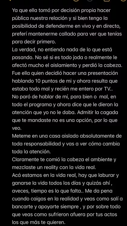 Pero Brian no dejó todo allí, ya que publicó lo que supuestamente es el último intercambio de mensajes que tuvieron con Sabrina, previo a su aislamiento antes de ingresar a la casa de Gran Hermano. “Bueno, gordo, te amo. Cuidate y confiá en mí siempre. Y no andes chapando por ahí con nadie”, ante lo que él responde con una risa, una declaración de amor y mandarle buenas energías previo a lo que vendría.