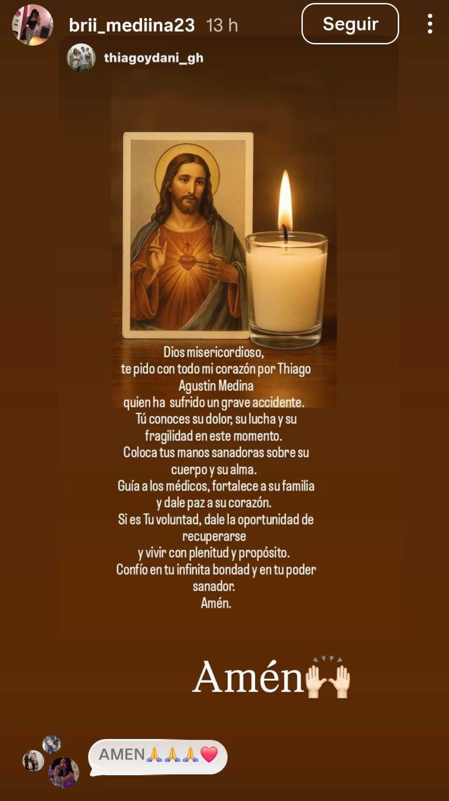 “Dios misericordioso, te pido con todo mi corazón por Thiago Agustín Medina, quien ha sufrido un grave accidente. Tú conoces su dolor, su lucha y fragilidad en este momento. Coloca tus manos sanadoras sobre su cuerpo y su alma. Guía a los médicos, fortalece a su familia y dale paz a su corazón. Si es tu voluntad, dale la oportunidad de recuperarse y vivir con plenitud y propósito. Confío en tu infinita bondad y en tu poder sanador. Amén”, se leyó en una historia de Instagram que mostró Brisa Medina.