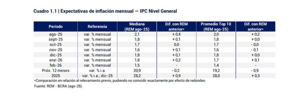 En lo relativo a la inflación, las proyecciones se corrigieron hacia arriba. Para el Índice de Precios al Consumidor (IPC) de agosto, cuyo dato oficial será informado por el Indec el próximo miércoles 10, los analistas del REM estimaron una suba del 2,1% (+0,4 p.p. respecto del REM previo). Respecto del IPC Núcleo, se espera un alza del 2,0% (+0,2 p.p.).
