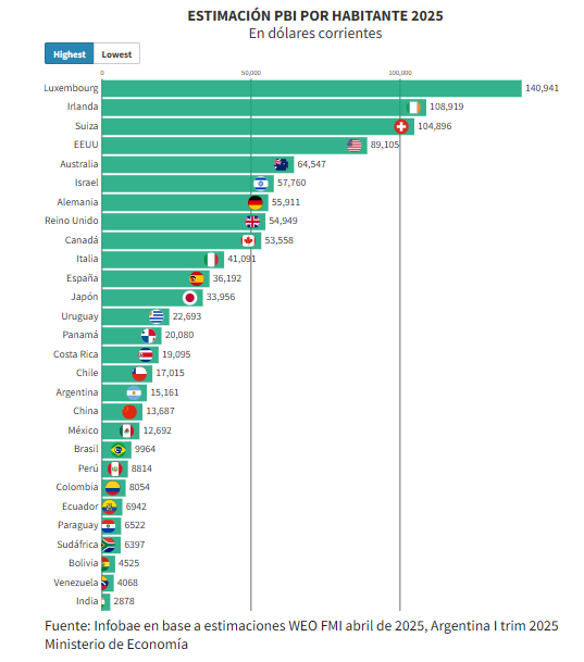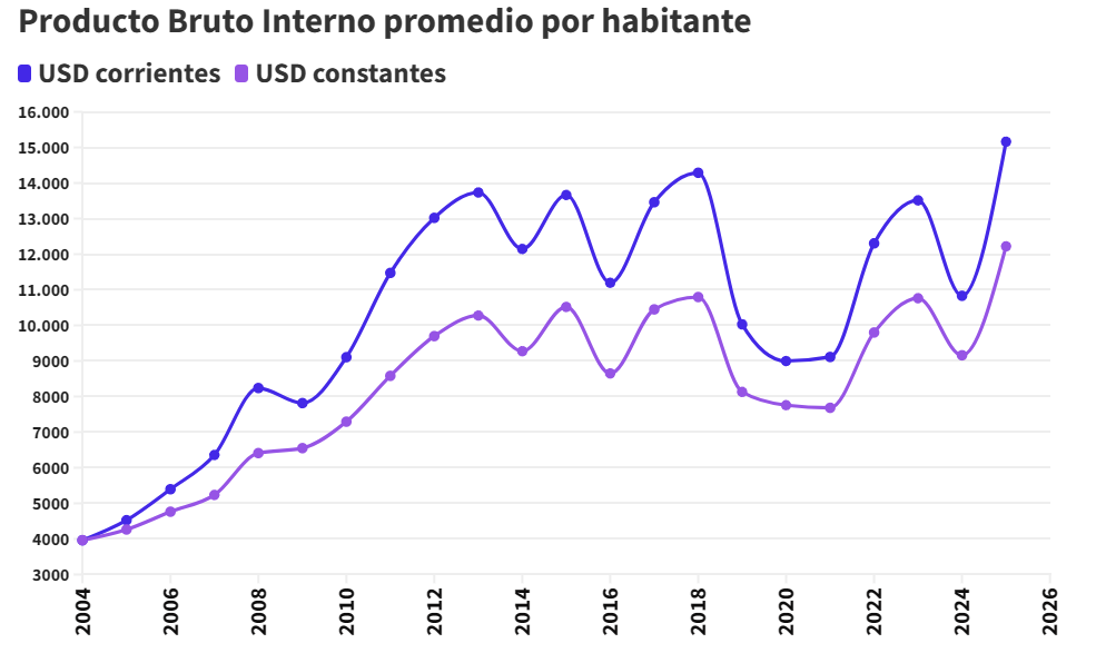 No obstante, el nivel de PBI per cápita en dólares conseguido en el primer trimestre -tradicionalmente el más bajo del año- superó la proyección anual del FMI para 2025. Esto anticipa que el promedio anual adoptaría un valor levemente superior al previsto por los organismos internacionales.