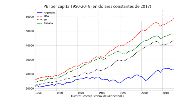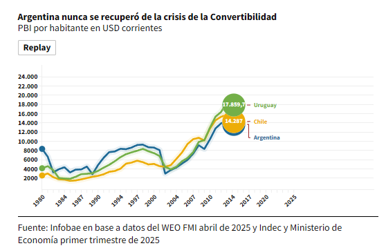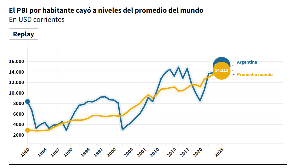 Aún así, Argentina permanece lejos de recuperar la proporción que mantuvo hasta el final de la convertibilidad, cuando promediaba más de 47% sobre el PBI per cápita mundial; ahora solo lo supera en un punto porcentual.