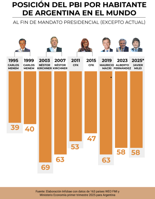 Al analizar los períodos presidenciales, desde Carlos Menem en 1995 hasta el primer trimestre de 2025, empleando los datos del último informe WEO FMI, Argentina alcanzó su mejor posición en la convertibilidad, en el puesto 39. Cayó al cierre de la segunda presidencia de Menem y retrocedió tras la crisis de 2001/2002. Luego, bajo la gestión de Néstor Kirchner y el primer mandato de Cristina Fernández de Kirchner, el país mostró cierta recuperación, aunque sin recuperar los valores previos.