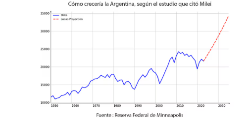 Sin embargo, un estudio de Juan Pablo Nicolini -académico de la Universidad Torcuato di Tella (UTDT) que actual miembro de la Reserva Federal de Minneapolis, integrante del sistema de la Reserva Federal (Fed) o Banco Central de EE.UU.- junto con Tobías Martínez González, proyecta que, bajo ciertas condiciones, el PBI per cápita argentino podría crecer a una tasa acumulativa anual del 4% anual acumulativo, tomando como base 2024, y pasar de USD 22.000 anuales por habitante -al tipo de cambio de poder de compra- a USD 34.000 en 2035, como muestra el gráfico.