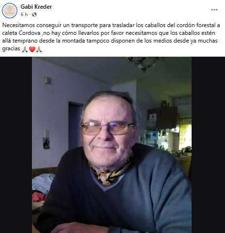 Gabriela Kreder, hija de Pedro, expresó su desesperación ante la falta de recursos: «Necesitamos conseguir un transporte para trasladar los caballos del cordón forestal a Caleta Córdova, no hay cómo llevarlos, por favor. Necesitamos que los caballos estén allá temprano, desde la montada tampoco disponen de los medios. Desde ya, muchas gracias».