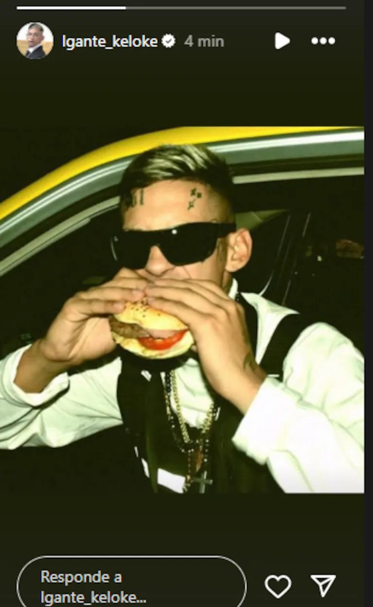 El cantante de cumbia 420 publicó en sus historias de la red social de la camarita una postal suya comiendo una hamburguesa. Claramente, el posteo está dedicado al futbolista, quien se refirió a las partes íntimas de la conductora con el emoji de esa comida rápida.