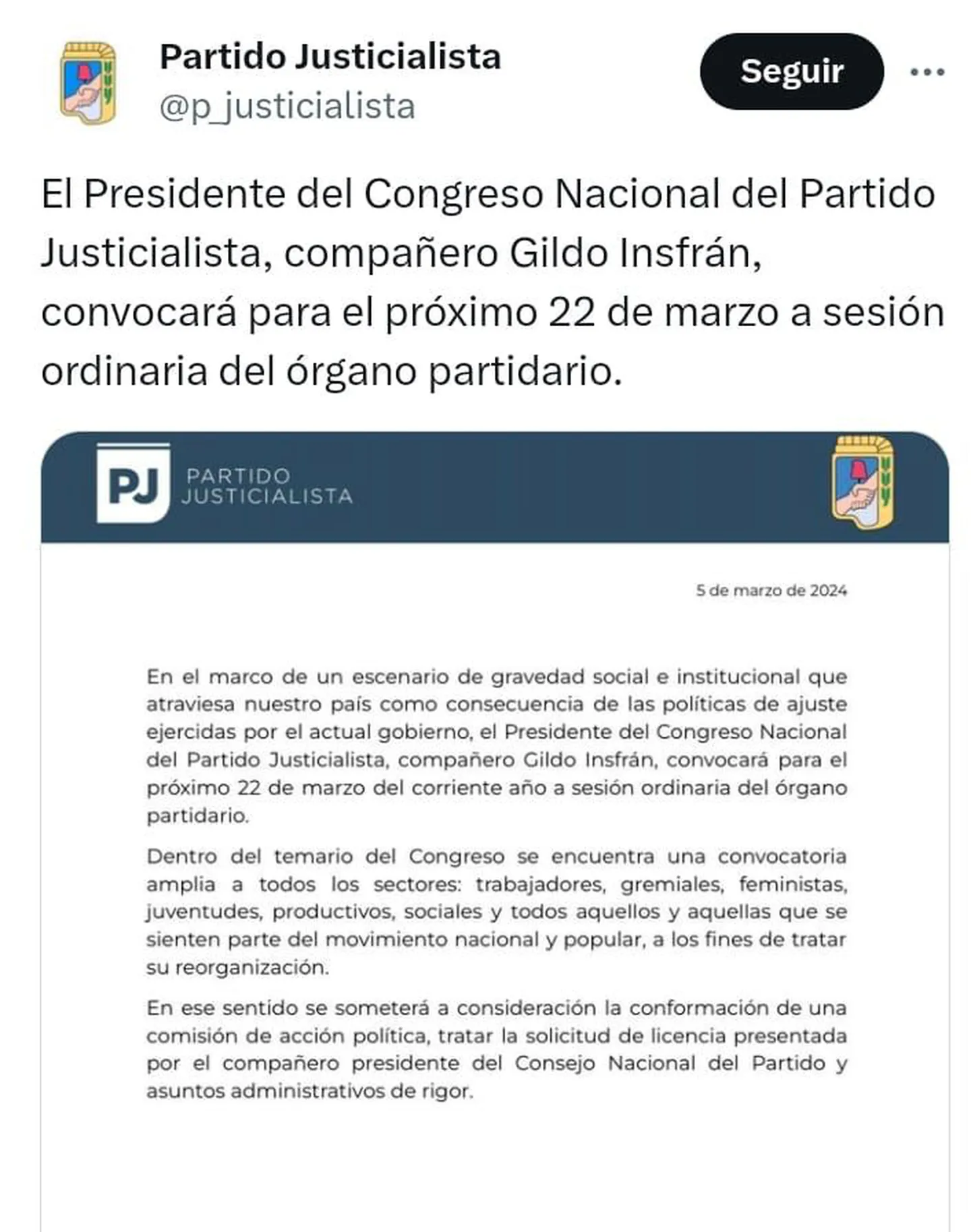 El PJ anunció en la convocatoria: “En el marco de un escenario de gravedad social e institucional que atraviesa nuestro país como consecuencia de las políticas de ajuste ejercidas por el actual gobierno, el Presidente del Congreso Nacional del Partido Justicialista, compañero Gildo Insfrán, convocará para el próximo 22 de marzo del corriente año a una sesión ordinaria del órgano partidario”.