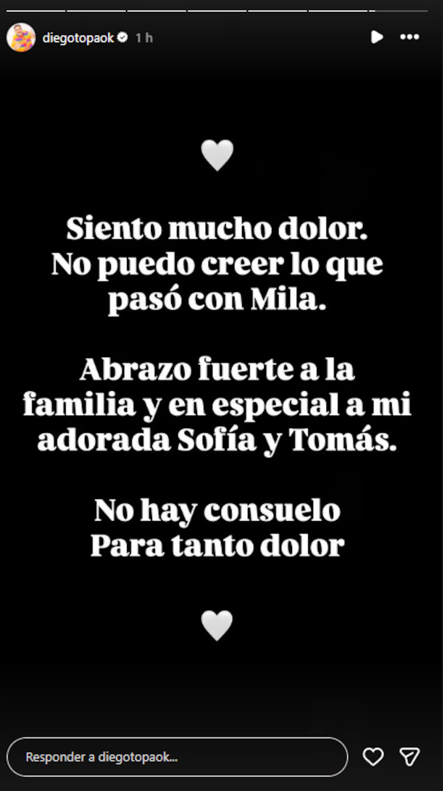 Al enterarse de la tragedia, el ídolo de los más pequeños no ocultó su desamparo. “Siento mucho dolor. No puedo creer lo que pasó con Mila”, escribió en una historia de Instagram junto a un emoji de corazón blanco.