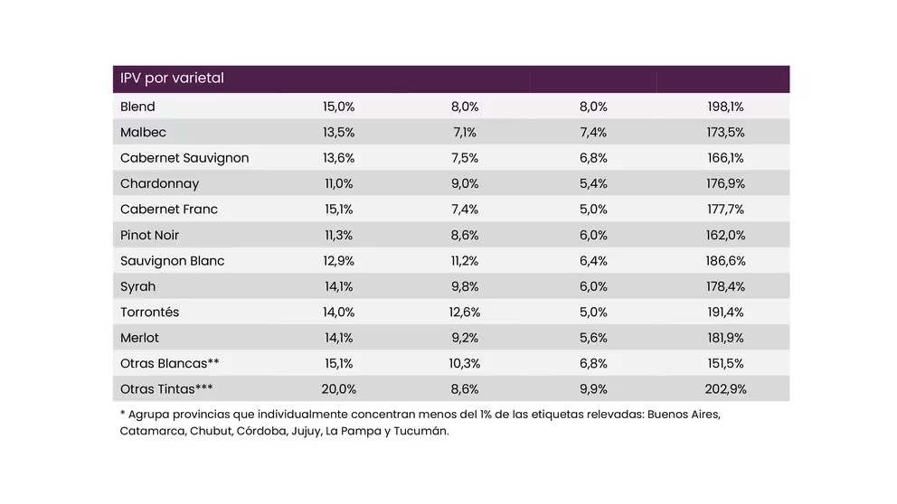 En el caso del ranking según variaciones anuales, “los blends de uvas tintas se ubican en primer lugar (con cerca de 200% de incremento), seguidos de la variedad torrontés (191,2%). Las etiquetas con menores aumentos anuales son las de Pinot Noir y Cabernet Sauvignon (162 y 165,9% respectivamente)”.