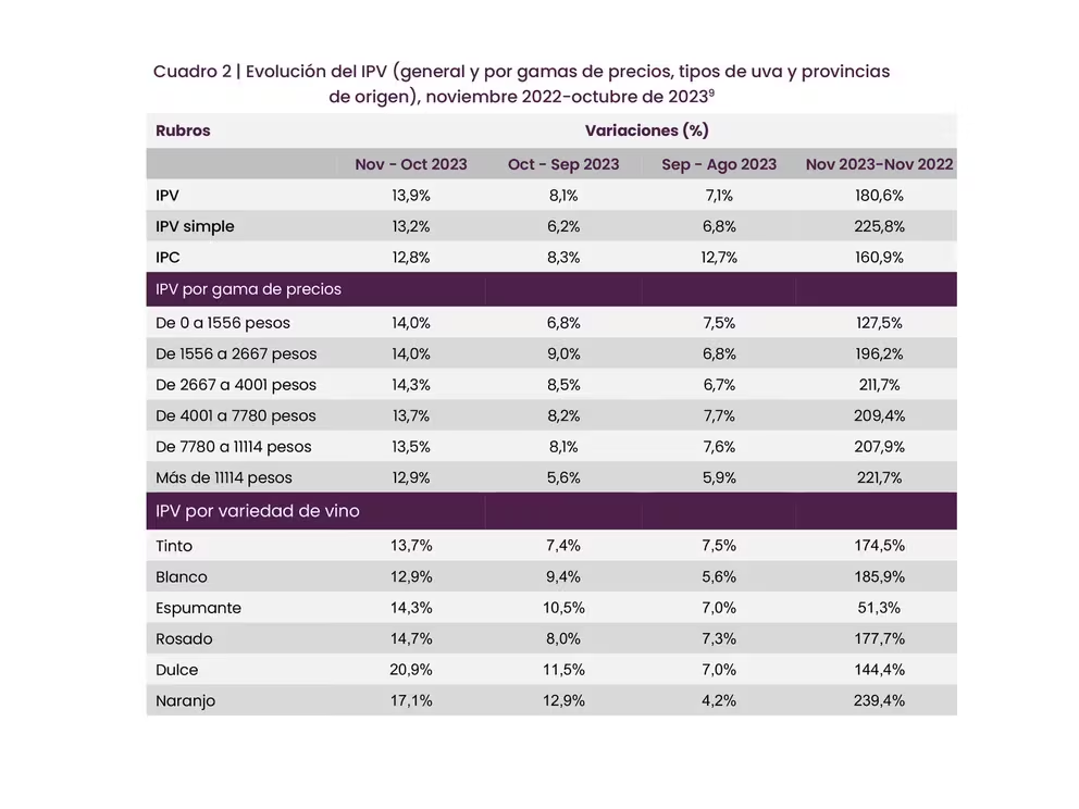 El trabajo del equipo de investigadores dirigido por Andrés López y Nicolás Grosman indicó que “la variación mensual del Índice de Precios del Vino (IPV) en noviembre de 2023 alcanzó al 13,9% en la comparación con el pasado mes de octubre del mismo año”
