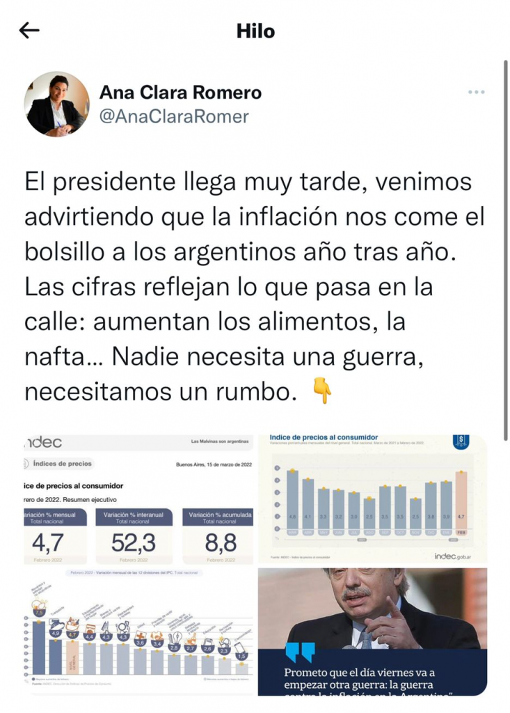 Por esto, la diputada nacional chubutense Ana Clara Romero salió al cruce diciendo que “el presidente llega muy tarde, venimos advirtiendo que la inflación nos come el bolsillo a los argentinos año tras año”, en referencia a una tardía lucha contra la inflación por parte de Fernández, en su tercer año de gestión.