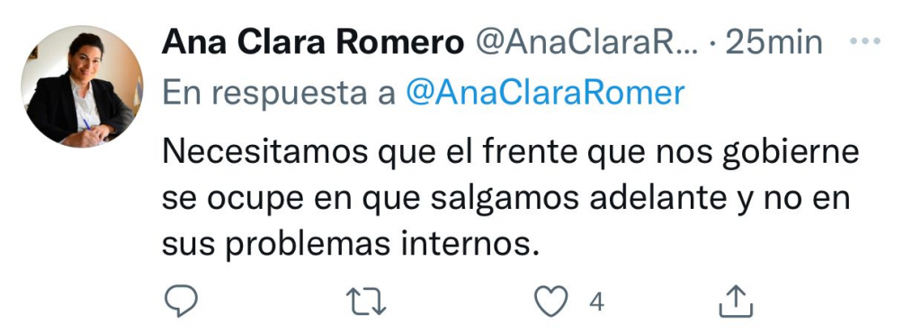 Por último, en el mensaje publicado en sus redes sociales apuntó a que “necesitamos que el frente que nos gobierne se ocupe en que salgamos adelante y no en sus problemas internos”.