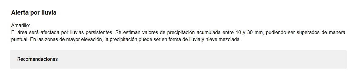 Para la jornada sabatina por la madrugada hay alerta amarilla por lluvias fuertes, que combinadas con las precipitaciones precedentes y posteriores podrían acumular hasta 30mm de agua.