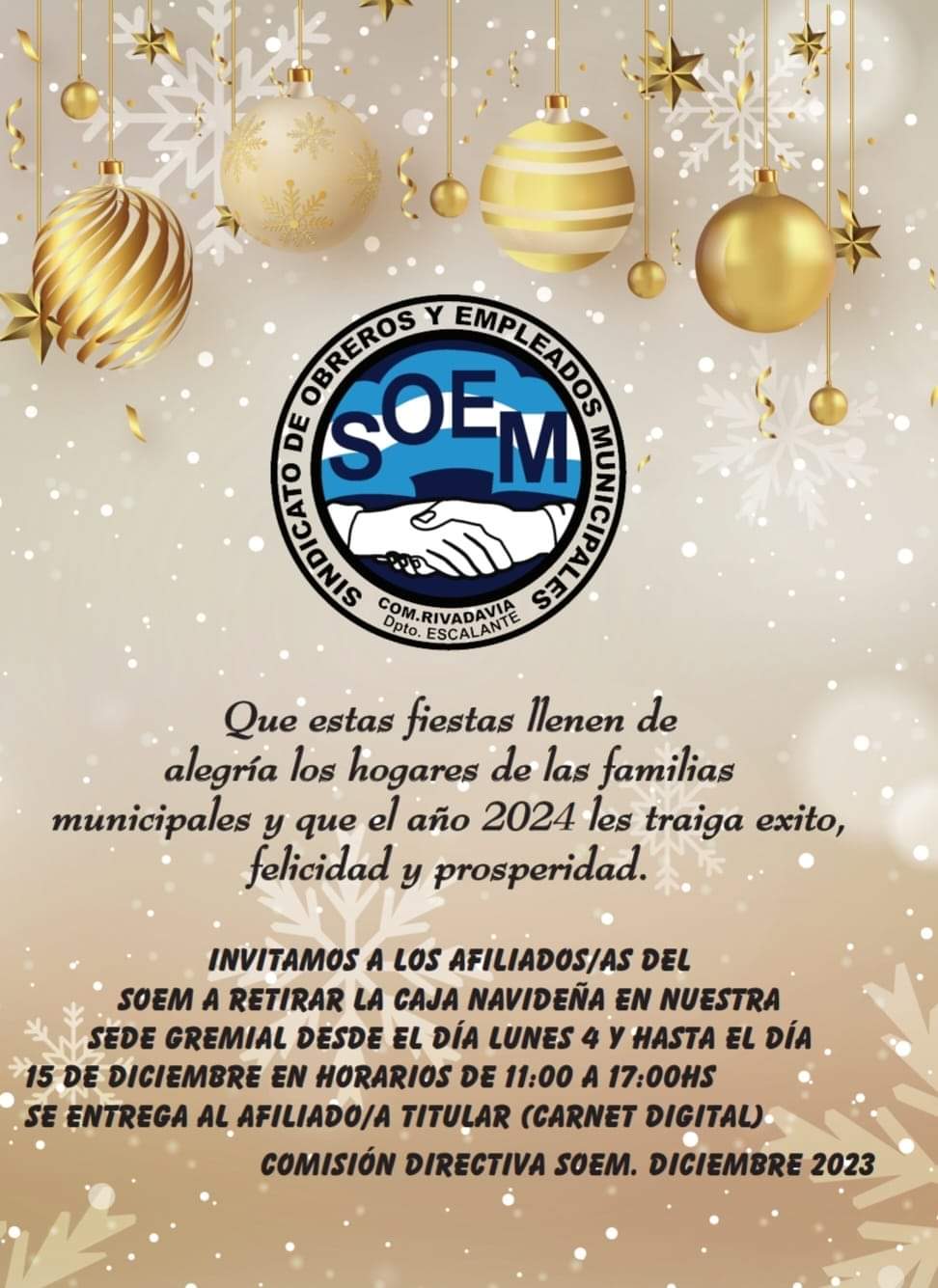 El Sindicato de Obreros y Empleados Municipales (SOEM) comunica a sus afiliados que ya se comenzó con la entrega de cajas navideñas. Quienes quieran retirarla deberán acercarse a la sede del Gremio en el horario de 11 a 17 horas.