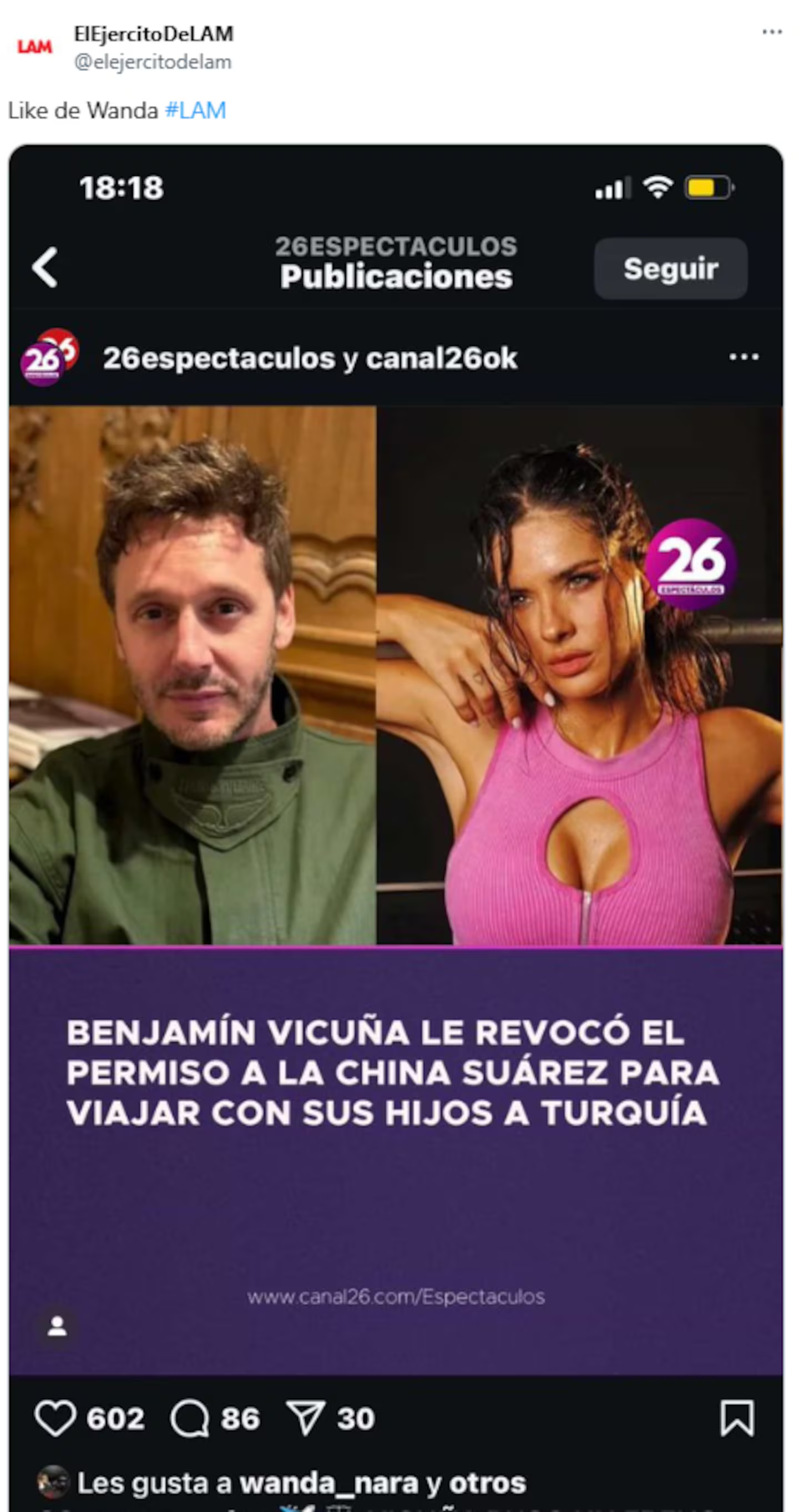 A través del perfil de X de @elejercitodelam difundieron el “me gusta” que Wanda le dio a una noticia en la que se podía leer: “Benjamín Vicuña le revocó el permiso a la China Suárez para viajar con sus hijos a Turquía”.