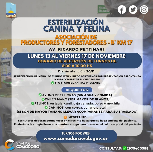 Desde el Municipio indicaron que el punto de esterilización canina y felina estará hasta el viernes 17/11 en la asociación de productores y forestadores ubicada en la Avenida Ricardo Pettinari.