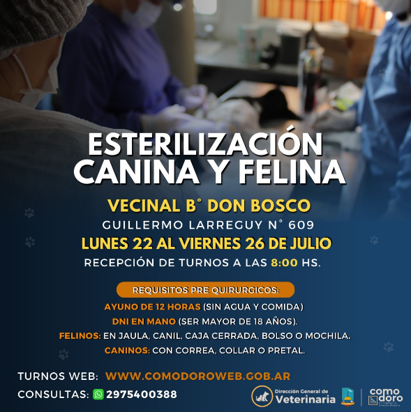 Desde el Municipio indicaron que el punto de esterilización canina y felina estará en la Vecinal del barrio Don Bosco, ubicada en Guillermo Larreguy 609, hasta este viernes 26/07.