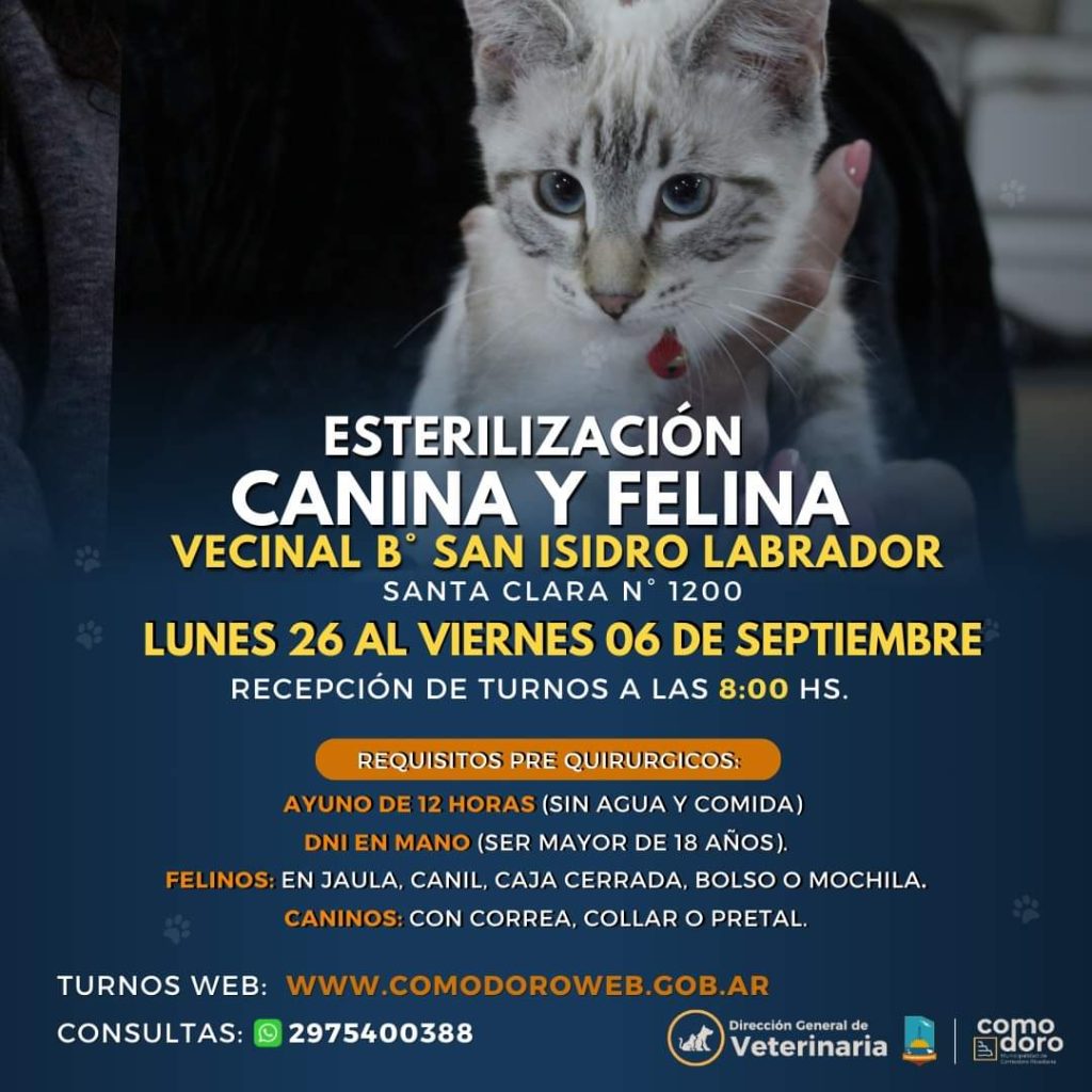 Desde el Municipio indicaron que el punto de esterilización canina y felina estará en en la Vecinal del barrio San Isidro Labrador, ubicada en Santa Clara 1200, hasta este viernes 06/09.