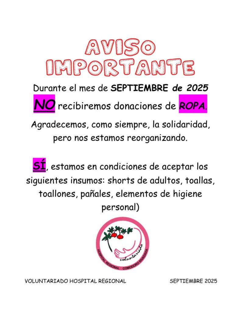 Ante cualquier duda o donación comunicarse al Facebook Voluntariado Hospital Regional Comodoro Rivadavia