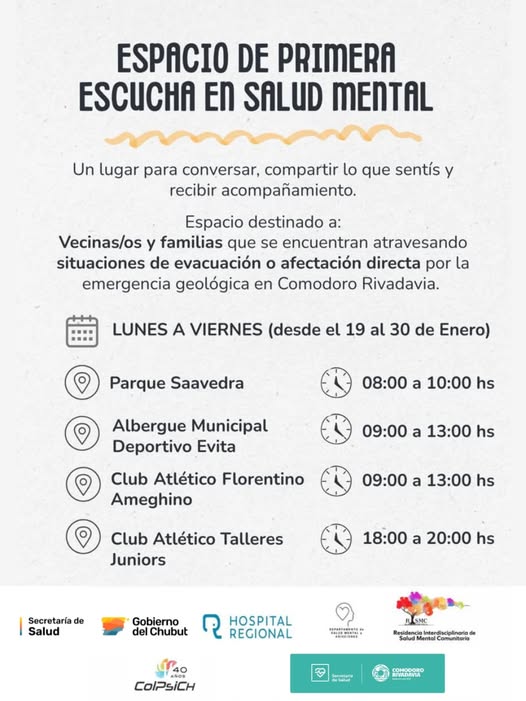 En el contexto de la emergencia que atraviesa Comodoro Rivadavia a raíz del deslizamiento del cerro Hermitte, se habilitaron espacios de primera escucha en Salud Mental destinados a vecinas, vecinos y familias que se encuentran atravesando situaciones de evacuación o afectación directa.