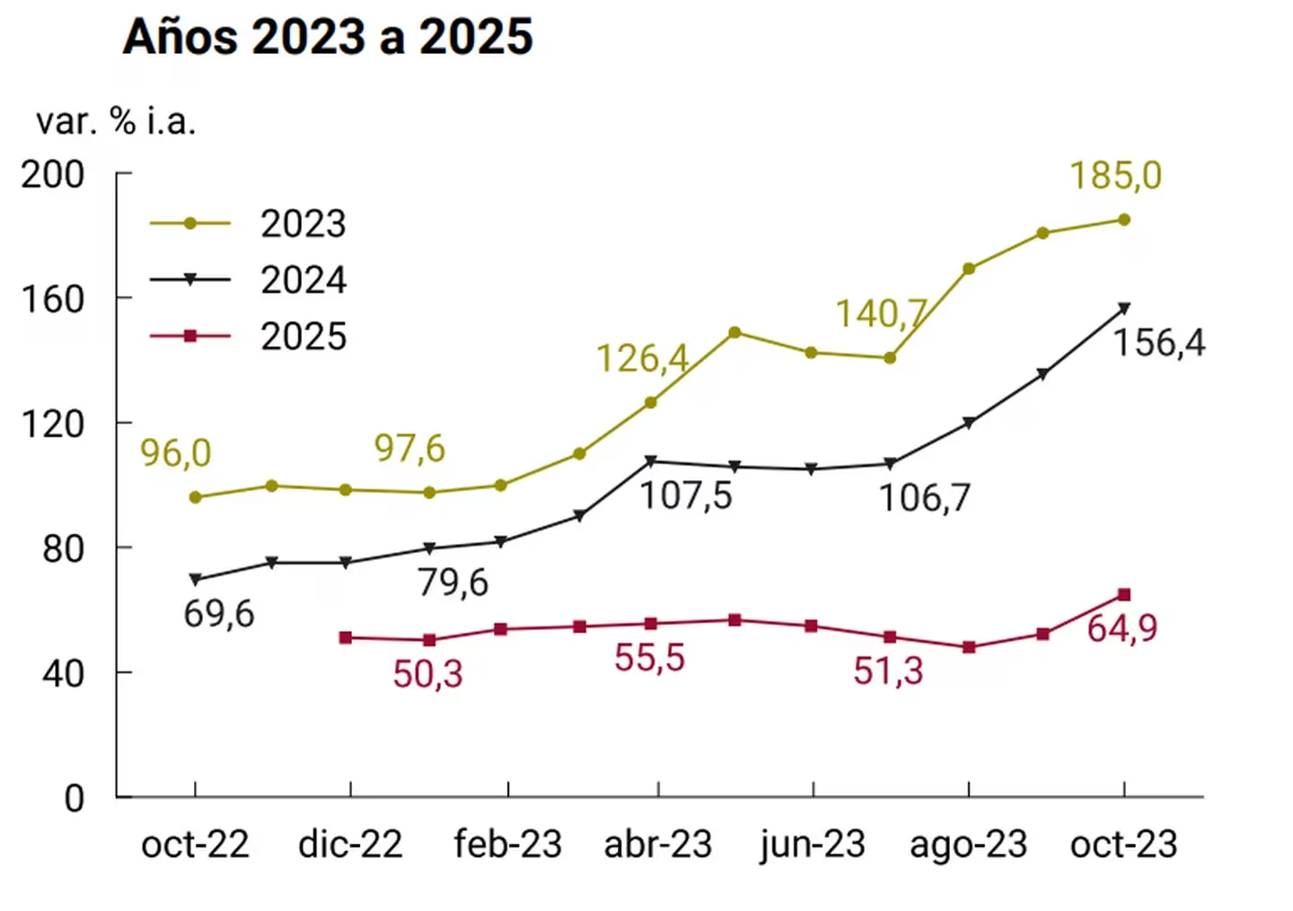 Una inflación de 11,5% en noviembre y 14% en diciembre. Para 2024, la ubica en 156,4%, y para 2025, en 64,9%.