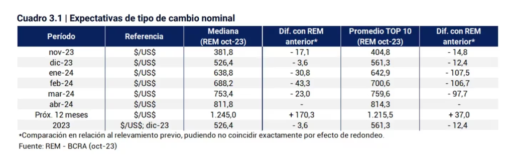 Un tipo de cambio nominal en $381,8 por dólar para el promedio de noviembre y $526,4 en diciembre. Para enero de 2024, estiman que el dólar alcanzará los $638,8.