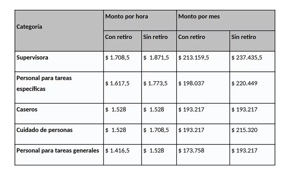 En lo que respecta al personal para cuidado de personas, los pagos por hora avanzarán de $1.414 a $1.528 por hora con retiro y de $1.581 a $1.708,5 sin retiro. El monto mensual ascenderá a $193.217 o $215.320, dependiendo de si la persona duerme en el hogar o no.