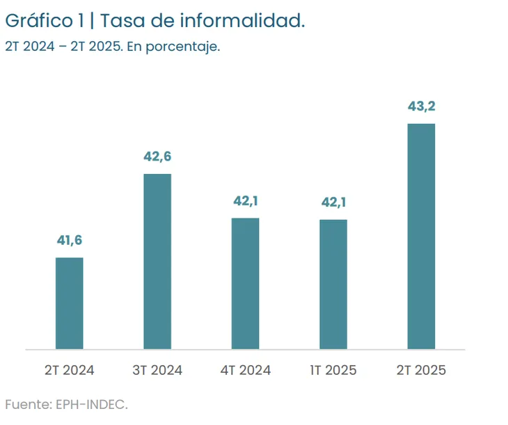La tasa de informalidad laboral en Argentina escaló al 43,2% en el segundo trimestre de 2025, según datos de la Encuesta Permanente de Hogares (EPH), lo que significa que cuatro de cada diez trabajadores operan fuera del marco legal en materia laboral, impositiva o de seguridad social. Este indicador representa un aumento interanual de 1,6 puntos porcentuales y marca el nivel más elevado desde 2008, con la excepción del segundo trimestre de 2022.